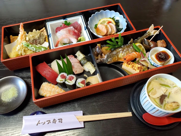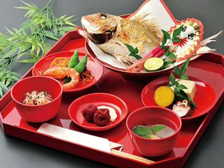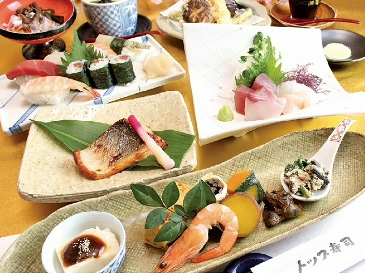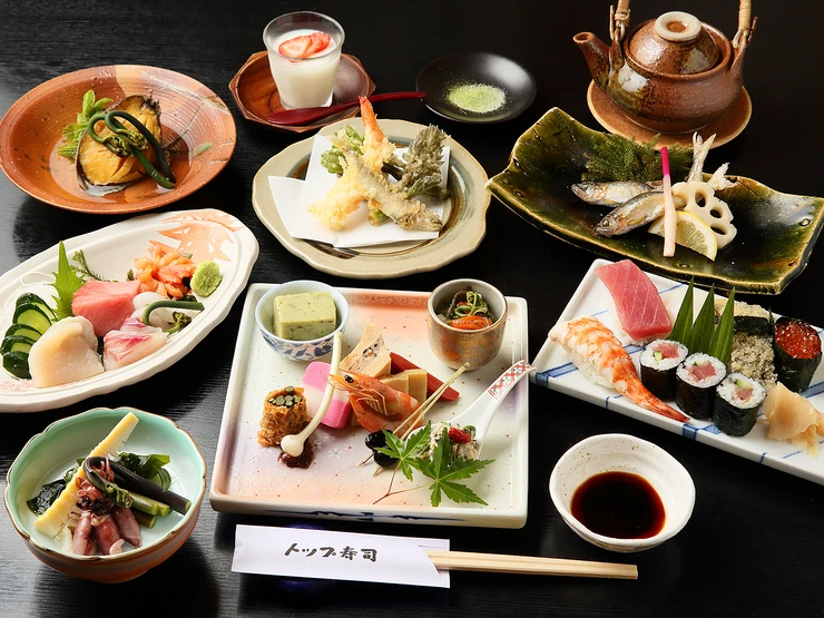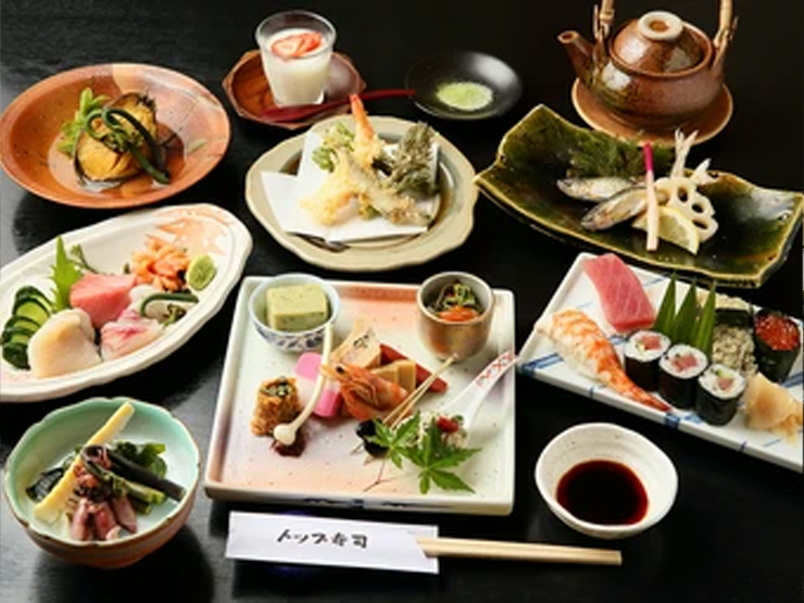 口取り、酢の物、刺身、天ぷら、焼き物、汁物、寿司、デザート